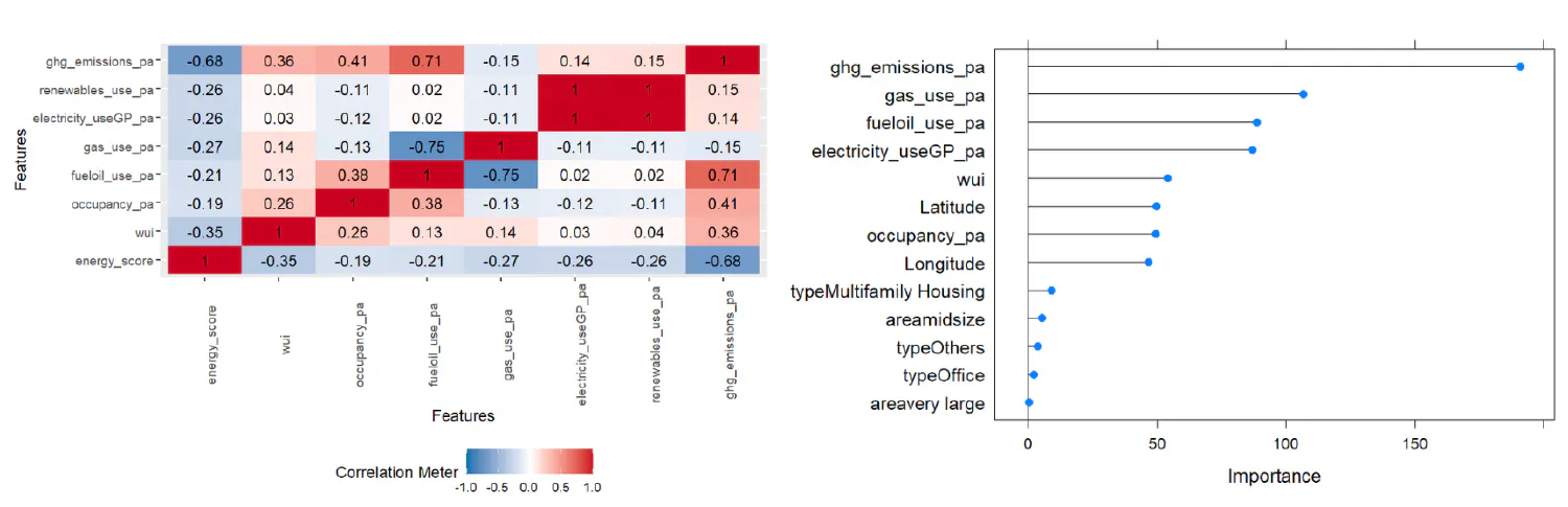 In addition, we do some feature engineering. In order to build comparable variables that are computed as total volumes, we divided them by the size of the buildings. As a result, we achieve a subset of 13 variables and more than 2500 observations. We didn’t include more features because many of the original variables were disaggregated measures of those that we chose.